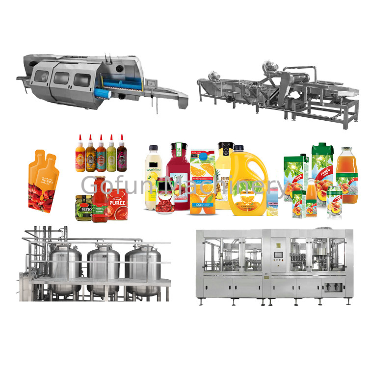 System przetwarzania surowców: Świeże owoce są myte, obierane, pozbawiane pestek i poddawane innym wstępnym procesom w celu przygotowania do produkcji skoncentrowanego soku owocowego lub pulpy owocowej.Sprzęt do produkcji skoncentrowanego soku owocowego lub pulpy owocowej: Przetworzone owoce są przetwarzane na skoncentrowany sok owocowy lub pulpę owocową poprzez procesy takie jak wyciskanie, rozdrabnianie i zagęszczanie.